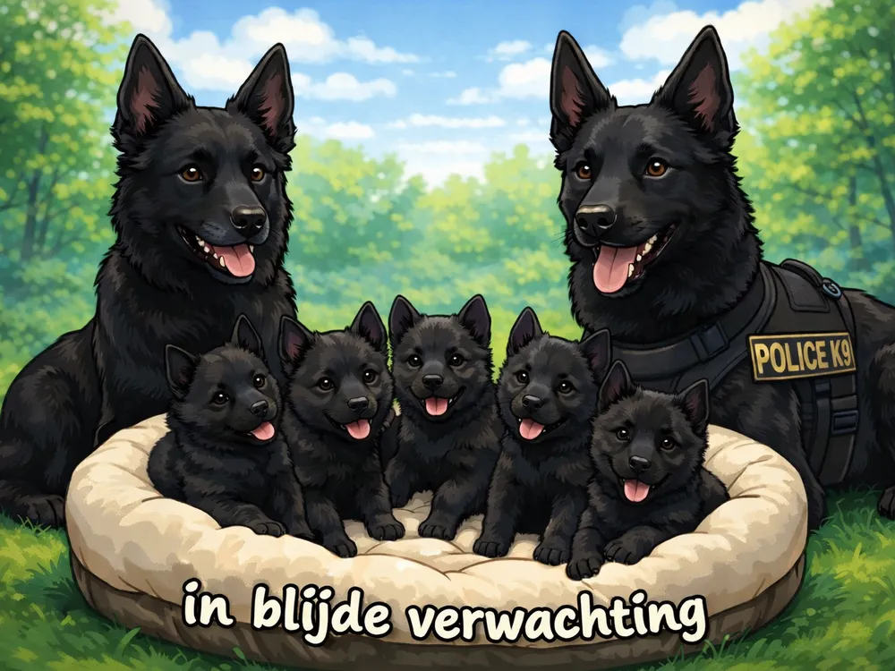 Beide ouderdieren hebben een zwarte vacht en worden gehouden in een aangepaste omgeving met voldoende ruimte, rust en structuur. De pups groeien op in nauw contact met het gezin en worden van jongs af aan goed gesocialiseerd met mensen, geluiden en andere honden.