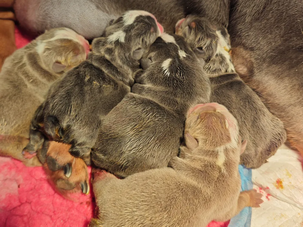 "Le bonheur pèse quelques grammes et a déjà de jolis plis... 🥰 Nos petits bouledogues anglais ont pointé le bout de leur nez ce matin ! La maman et les bébés se portent à merveille. Bienvenue au monde les petits cœurs ! 🐾✨" 2 femelles 3 mâles Voici deux des bébés de sa précédente portée ( ils ont 3 ans ) Et la portée de ce jour