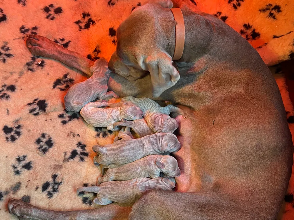 Wij verwachten een prachtig nestje Weimaraner pups. De pups worden in de woonkamer geboren en gesocialiseerd. Als dierenarts vind ik zowel een goed karakter als een goede gezondheid erg belangrijk. De mama is in bezit van een fci stamboom en getest. De vader is zorgvuldig geselecteerd en ook in bezit van correcte testresultaten. Samen hebben zij al een eerder nestje gehad. Ook voor de verdere opvoeding en gezondheidsvragen kunnen de toekomstige baasjes altijd terug bij mij terecht.