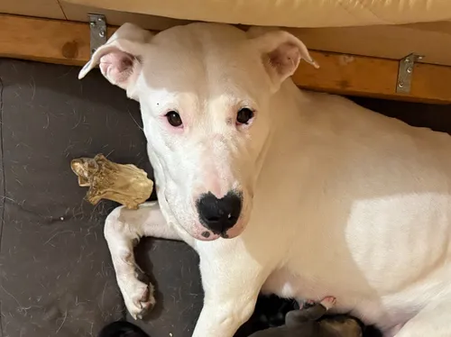 • Moeder: Een rasechte Dogo Argentino. Ze is een prachtige, zelfstandig denkende hond, zij is “super chill" en een voorbeeldige moeder. Haar pups profiteren van haar rustige karakter en scherpe visuele focus.