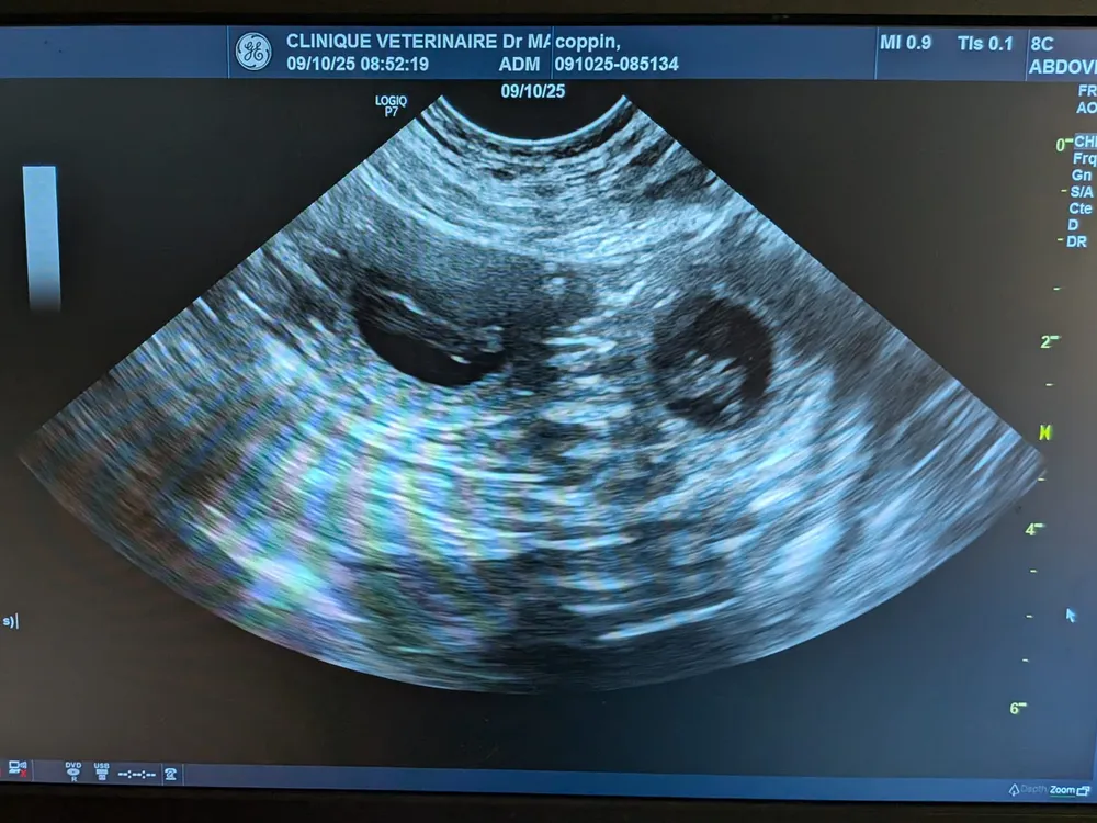 Wicka et Merlot sont 2 supers chiens. Calmes, attentionnés, joueurs et surtout exceptionnellement bien dans leur tête. Tous les 2 vivent en famille. Merlot en Flandre Orientale et Wicka dans le brabant Wallon. L'échographie de Wicka a eu lieu ce 9 octobre 25. Nous sommes à J+23 de la 1ère saillie. Une radio sera réalisée début novembre pour connaître le nombre exact de chiots. Comme vous le voyez sur les photos, Wicka est noire et Merlot est Brun. Wicka est noire pure et Merlot foie (brun) pur. Selon la théorie de la génétique, tous les chiots devraient être noirs porteurs brun mais qui peut prédire avec certitude ce que nous réservera notre chère et respectueuse et respectable mère nature ?